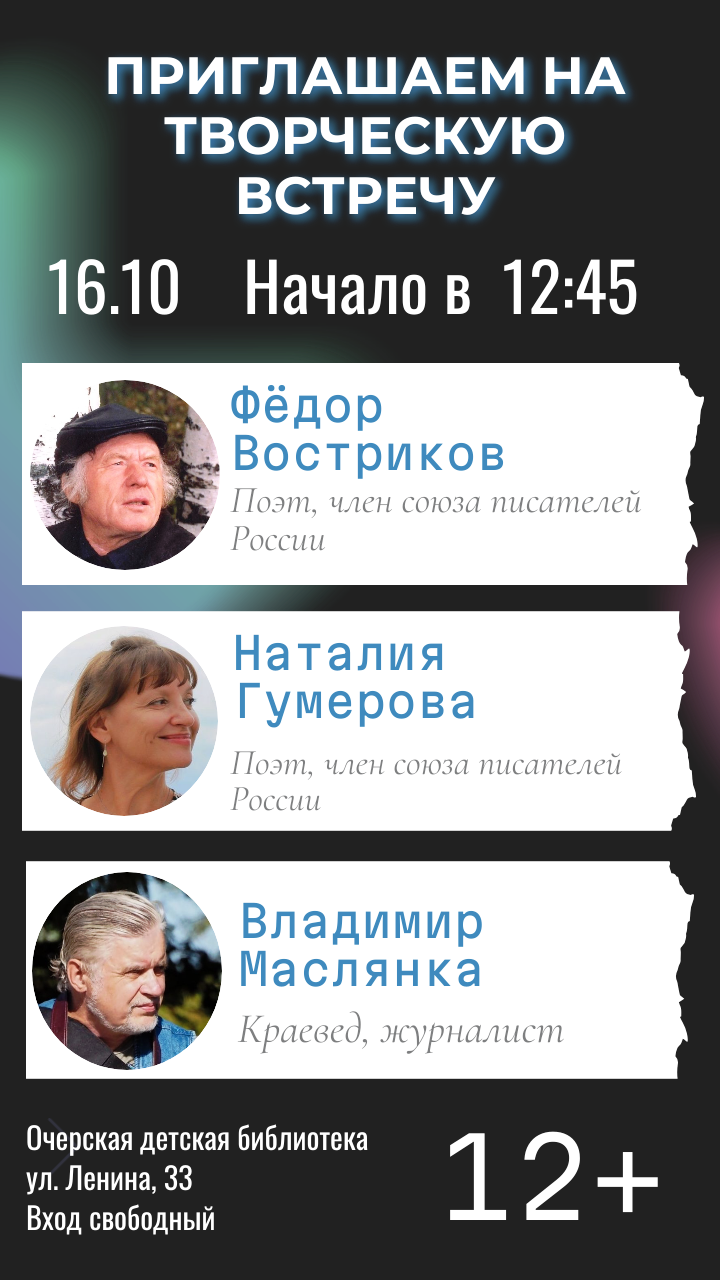 16 октября в 12:45 в рамках Межтерриториальной конференции "Краеведческая инициатива" состоится творческая встреча с пермскими поэтами Фёдором Востриковым и Наталией Гумеровой, также во встрече примет участие журналист, научный сотрудник музея В. П. Астафьева Владимир Маслянка ( г. Чусовой). Мероприятие пройдет в помещении Детской библиотеки (ул. Ленина, 33). Вход свободный (12+).